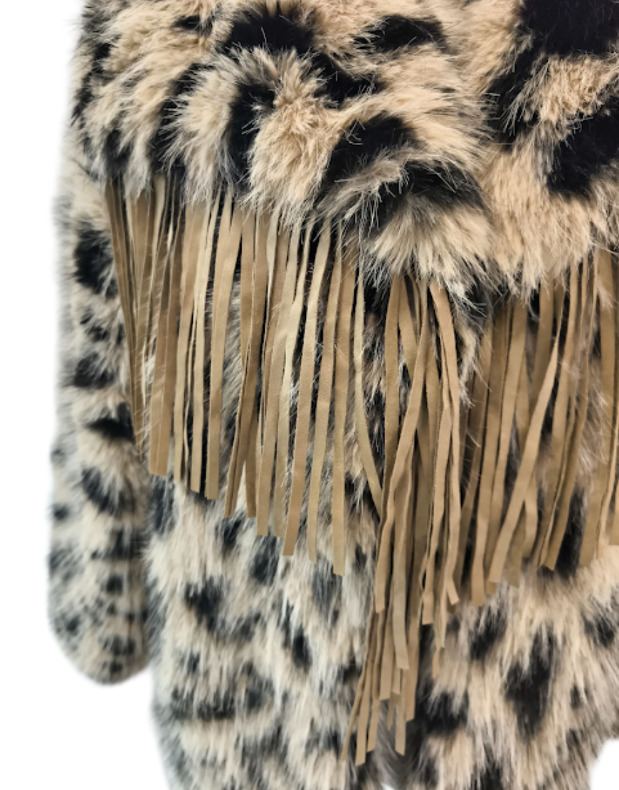 Esta chaqueta de pelo sintético combina el encanto del estampado animal print con un toque boho gracias a sus flecos en la parte delantera.